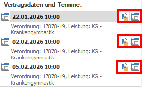 Des weiteren besteht die Möglichkeit direkt in den Patienten zu wechseln oder sich über die Vertragsdaten und Termine die jeweiligen Verordnungen aufzurufen, sowie direkt in den Terminplan zu wechseln.